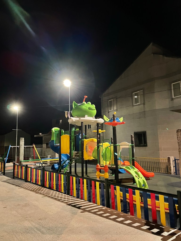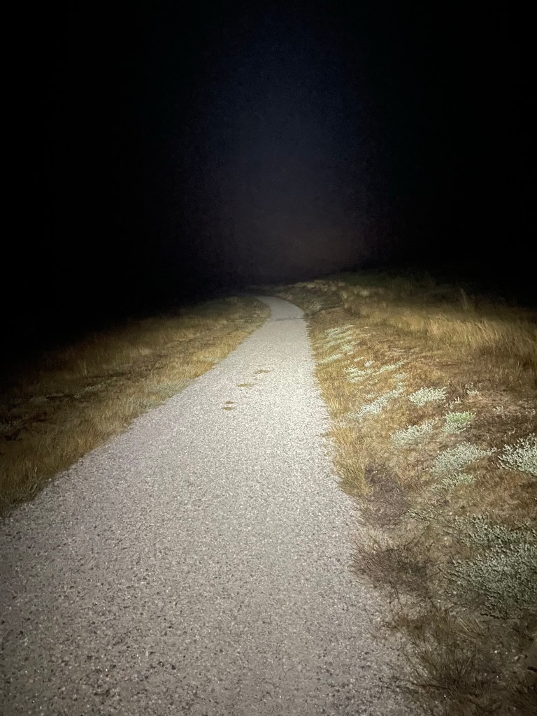Heute war die letzte lange Etappe, daher ging’s nochmal im Dunkeln los. Da es in jedem Ort, mag er noch so klein sein, einen Spielplatz gibt, heute einer bei Nacht. Der Sternenhimmel war wieder umwerfend.
