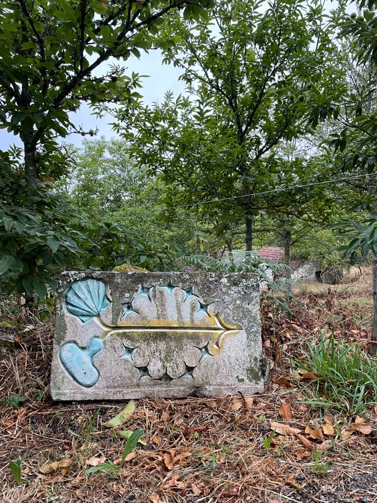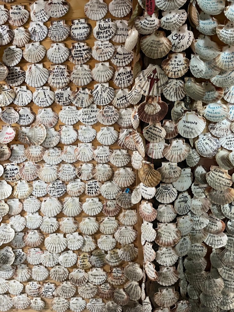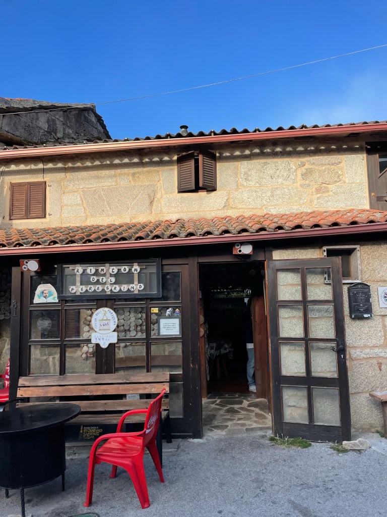 Oben hat mich dann in dem sehr kleinen Ort Alberguería eine tolle Bar erwartet. Speziell für Pilger und wer sonst noch kommen will. Überall hingen Jakobsmuscheln, ich habe auch eine beschriftet und es gab ein erstes Frühstück.