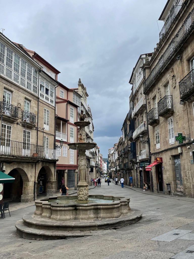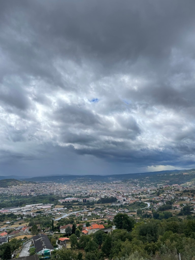 Der Wetterbericht hatte für heute Regen angesagt, der auch kam. Es waren jedoch nur ein paar leichte Schauer und Dank meines Regenschirms (Danke Heike) bin ich trocken am Ziel angekommen. Sieht man vom verschwitzten Hemd ab, denn es ging direkt steil den Berg hoch. Daher erst mal ein Blick von oben auf Ourense und dann noch ein paar Eindrücke der Stadt. Heute nur aus der schönen Altstadt.