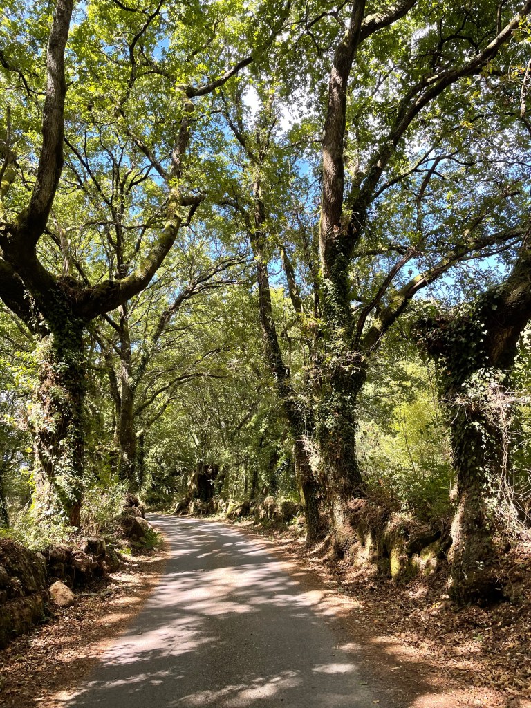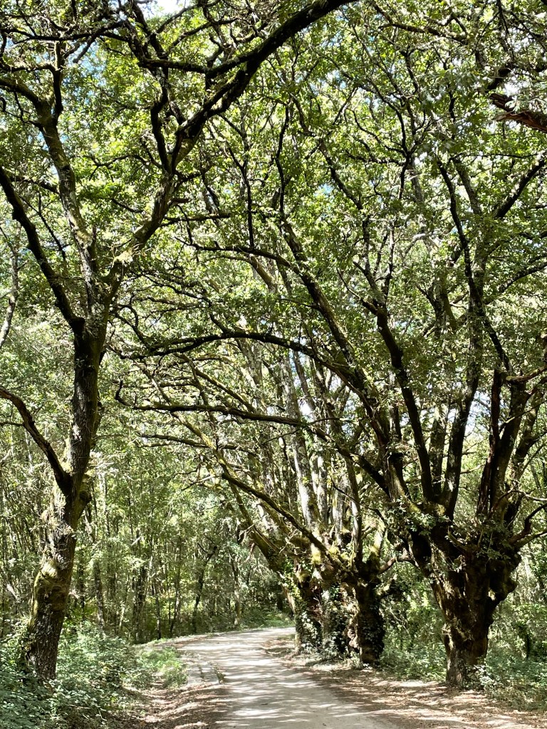 Die alten Verbindungswege sind meistens mit riesigen Eichen gesäumt. Im Vergleich zur La Mancha ist man hier selbst bei 40 Grad kühl im Schatten unterwegs.