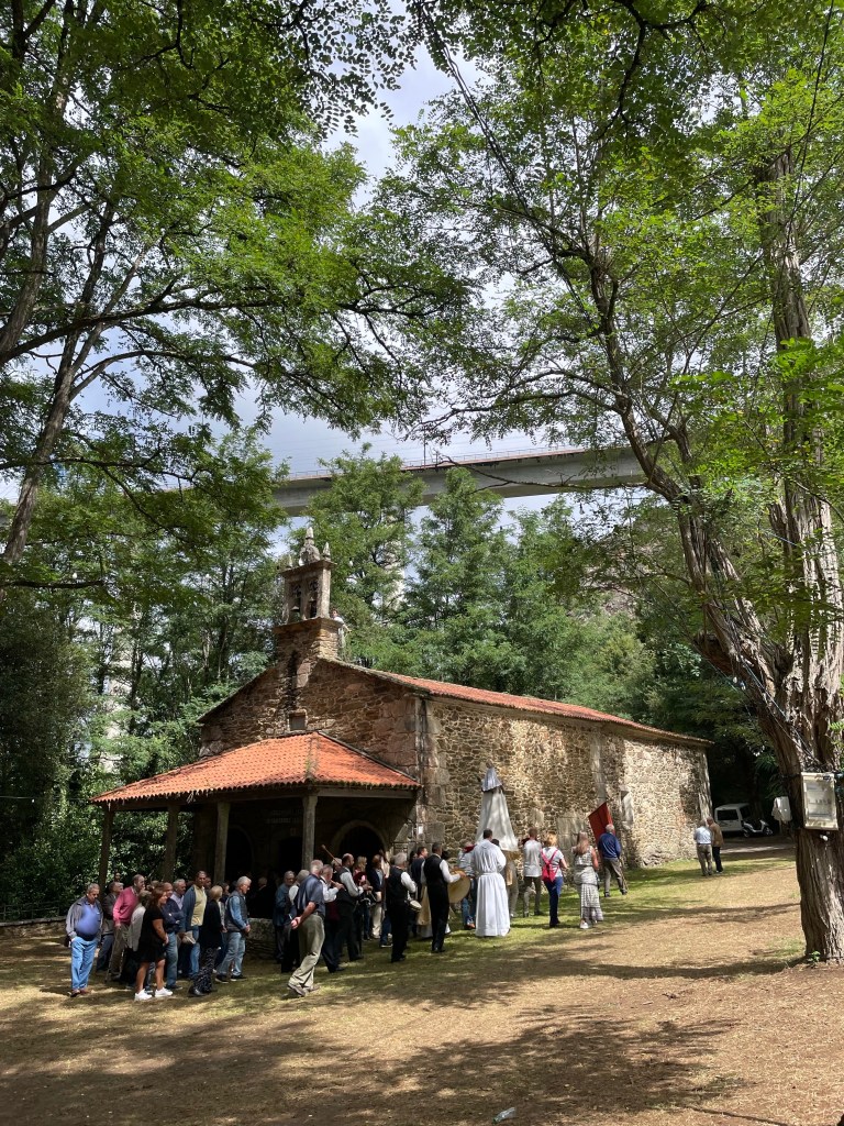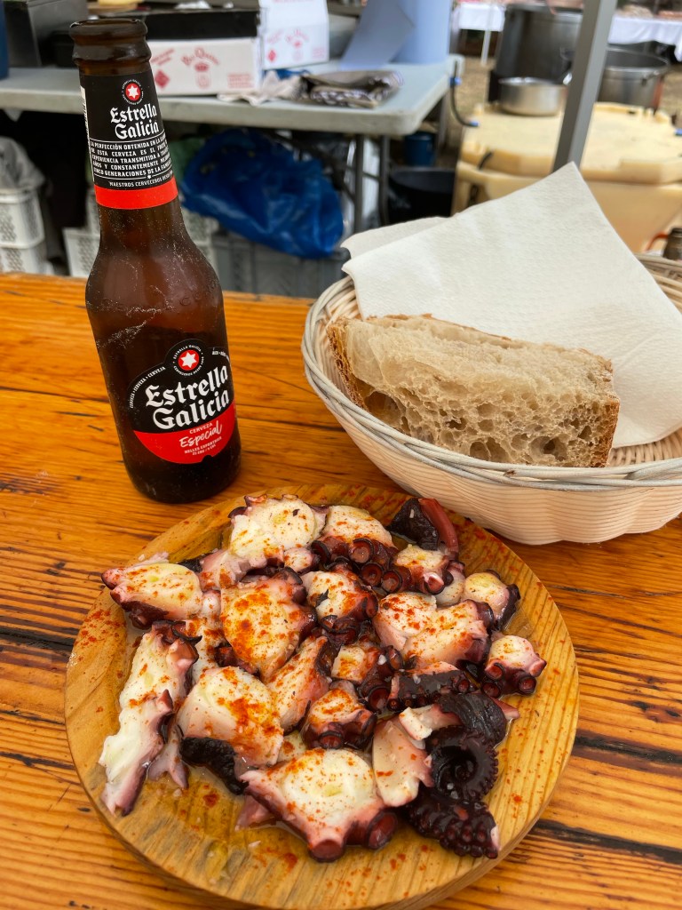 Kurz vor Ponte Ulla, und somit auch kurz vor Ouseiro, traf ich mal wieder auf eine Fiesta. Eine Madonnenstatue wurde um die Kirche getragen, eine traditionelle Kapelle spielte und es gab viel zu essen. Der Pulpo wurde frisch dort gekocht und angemacht. Extrem lecker.