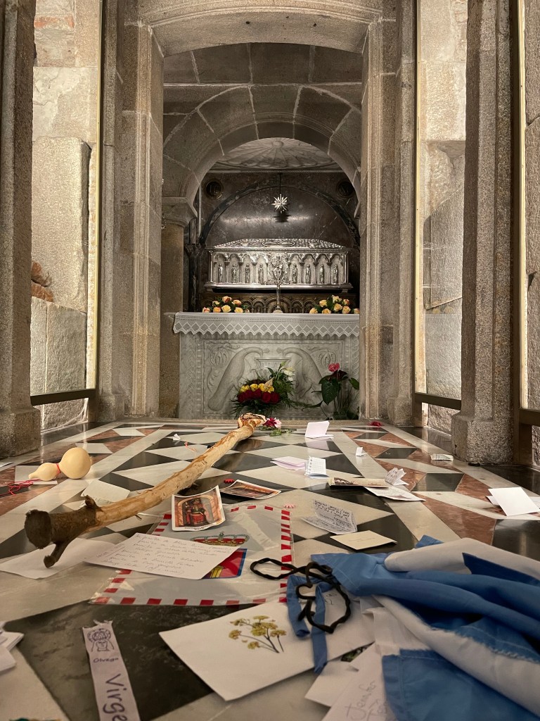 Um 12 Uhr habe ich einen zweiten Versuch gestartet. Dieses Mal war die Kirche überfüllt, dafür hat der Bischof die Messe gehalten und er hat die Pilger in fünf Sprachen begrüßt. Zum Abschluss kam auch das Weihrauchfass zum Einsatz.