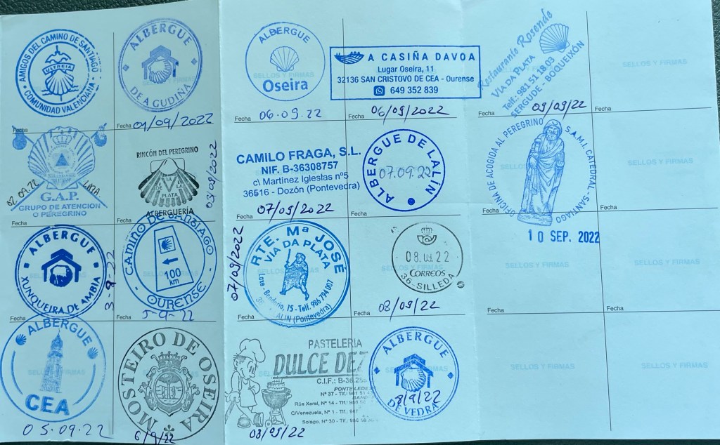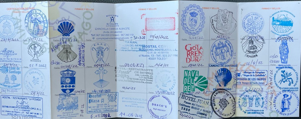 Bilder des Tages sind meine Stempelsammlungen aus meinen Pilgerausweisen, dem Credencial. Ich hatte zwei, einen für den Camino Levante, der wohl nicht als offizieller Jakobsweg in Santiago zählt und dann einen, auf Basis dessen ich dann auch meine Compostela erhalten habe.