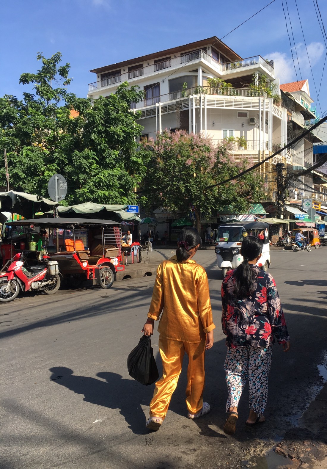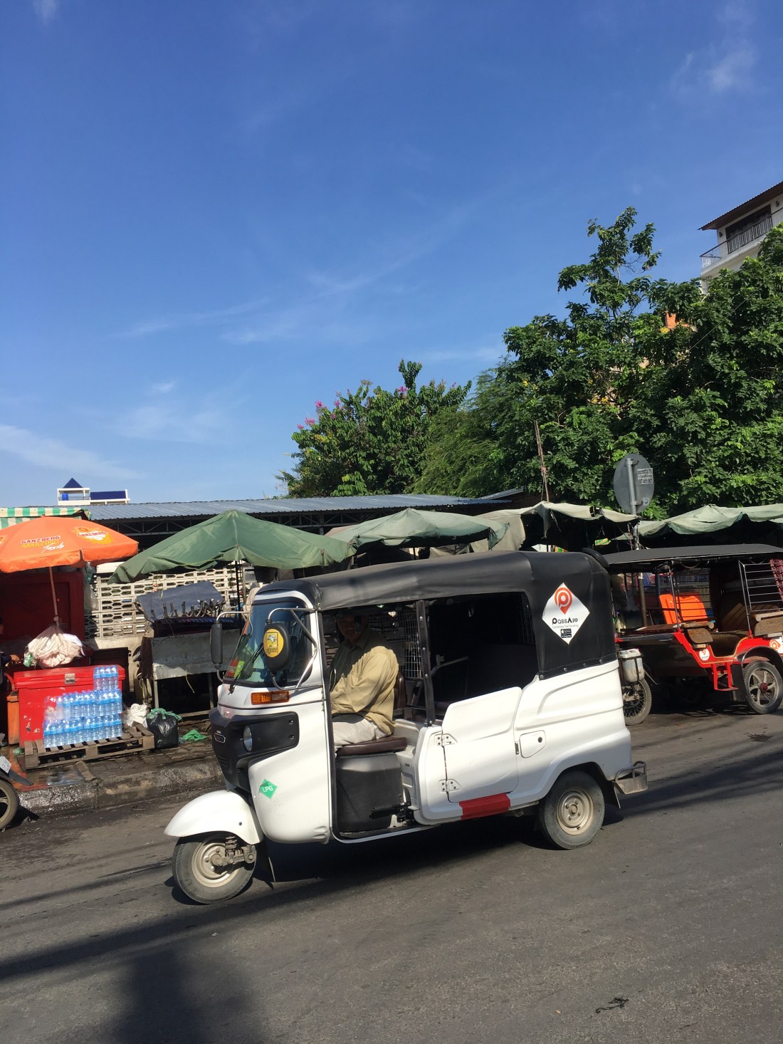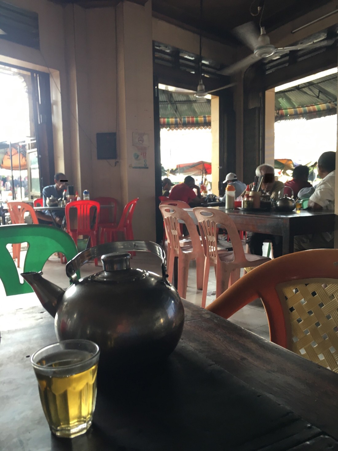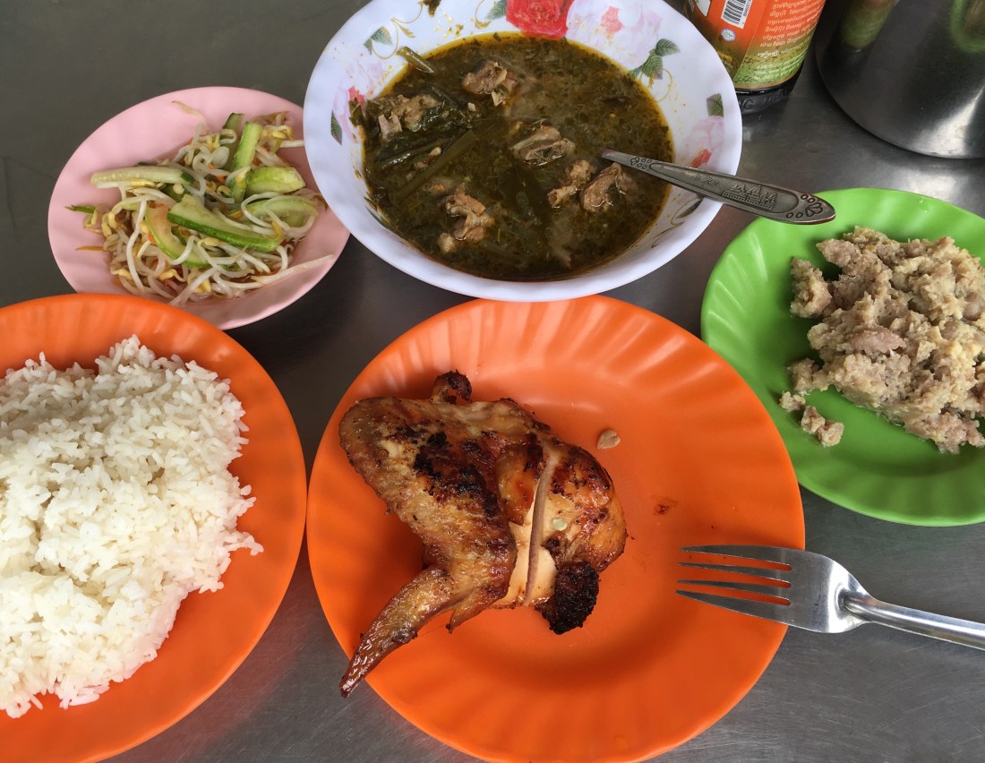 Dies ist neben der Nudelsuppe das Frühstück, das der Kambodschaner und die Kambodschanerin zu sich nehmen. Somit mache ich das natürlich auch. Da sich toll gegrillter Schweinebauch dabei befindet schmeckt es mir besonders gut.