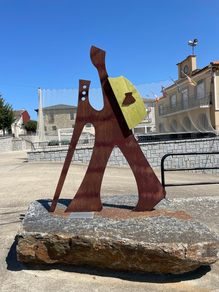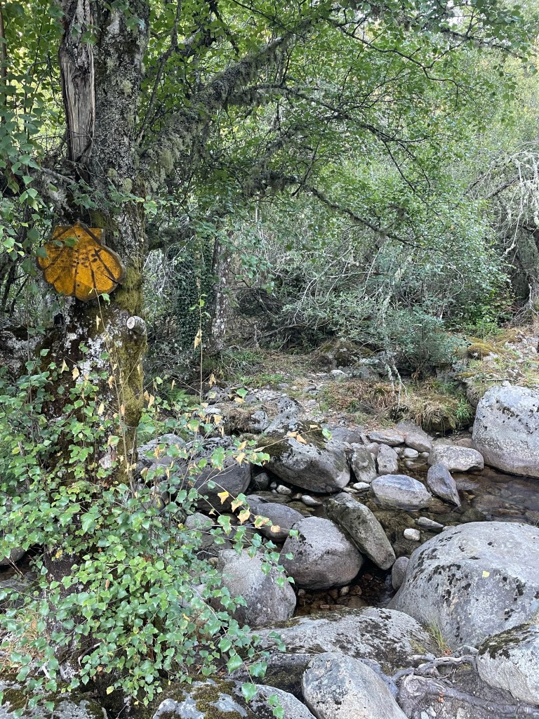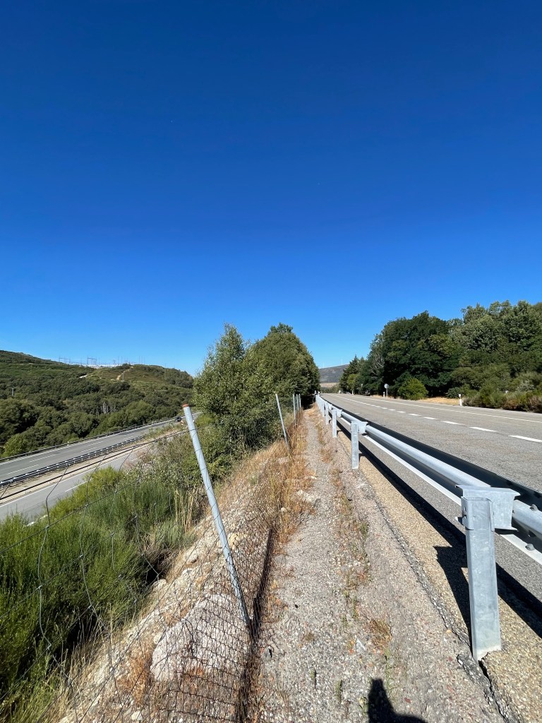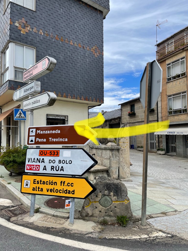 Bis ich oben an der Grenze zu Galicien ankam. Hier gab’s Frühstück mit Blick ins Tal. Die galicischen Wegweiser enthalten nun immer die Reststrecke bis Santiago. Auf die dritte Stelle hinterm Komma genau. Das hat mich anfangs etwas gestresst, weil ich immer ausgerechnet habe wie viel ich heute noch laufen muss.